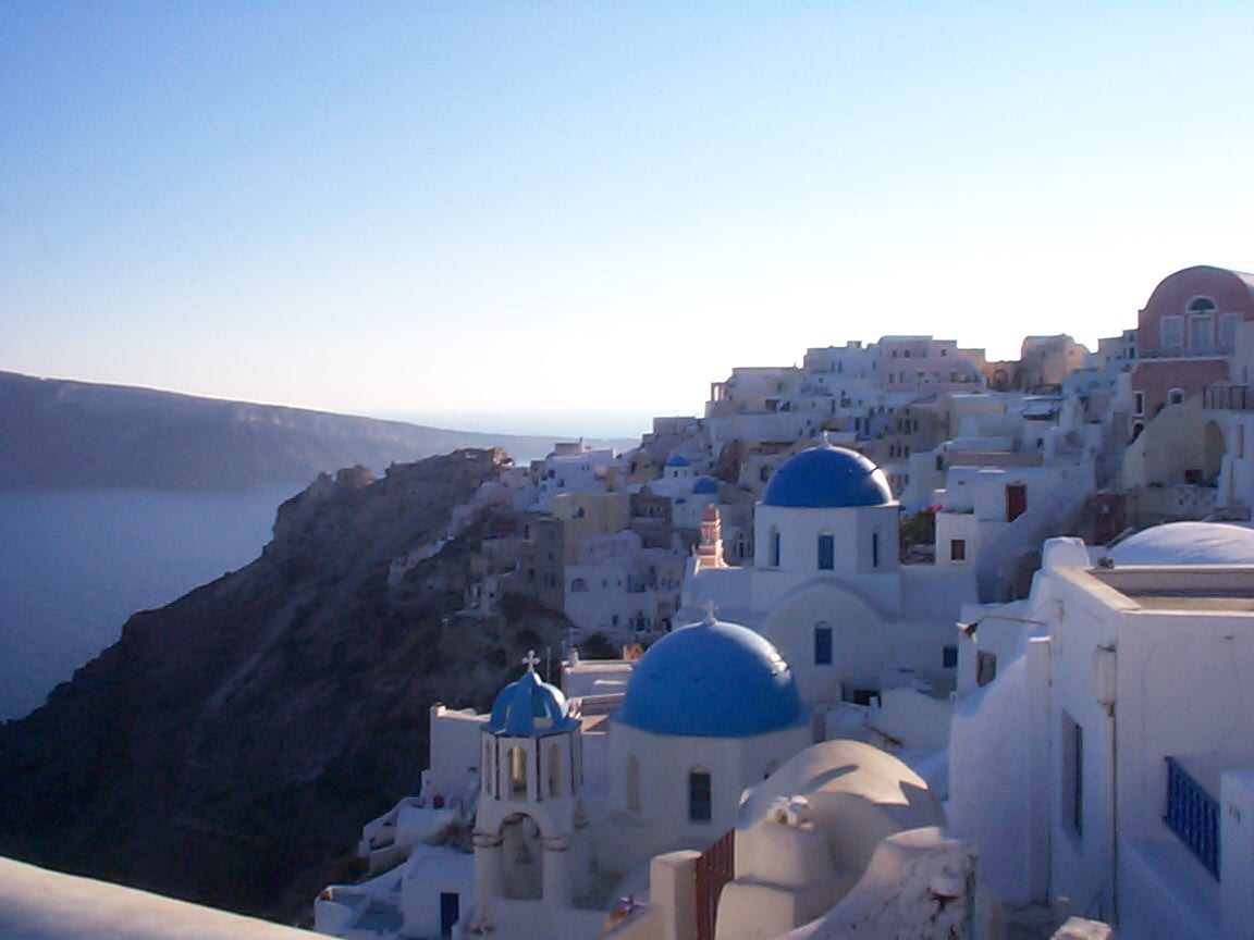 Probably our dream vacation would be a return to Santorini in Greece. (We ate dinner with another couple at a restaurant terrace that had the view pictured).